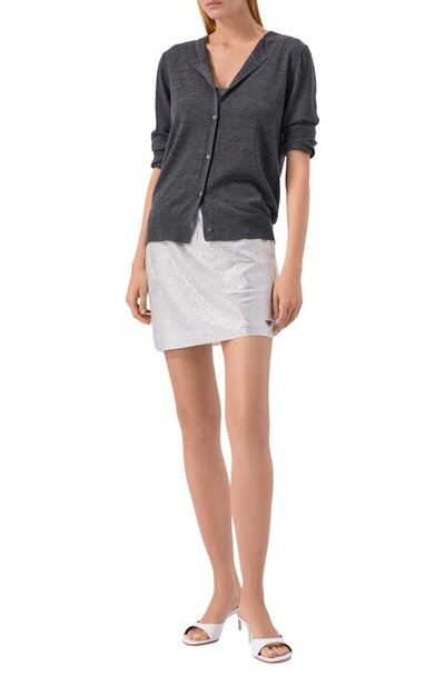 Мини-юбку с узким эластичным поясом сшили из хлопкового джерси и украсили спереди прозрачными кристаллами. На принадлежность модели марке указывает небольшой эмалевый треугольник внизу.