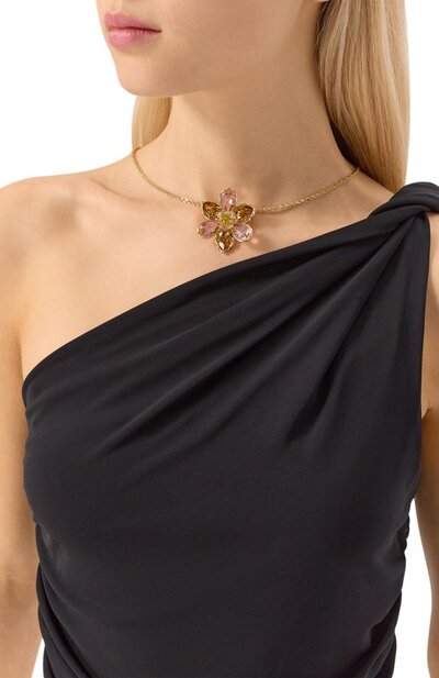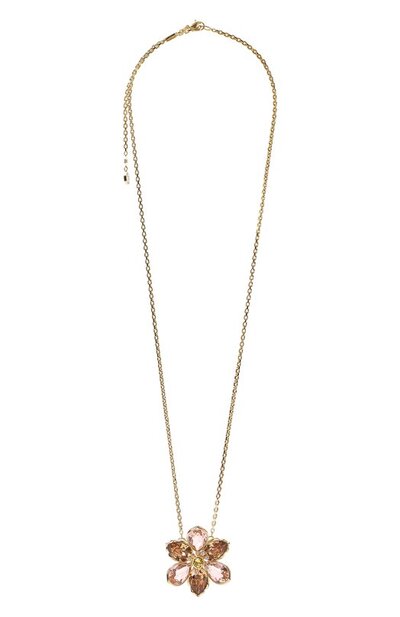 Подвеску Idyllia в виде цветка выполнили из латуни с золотистым покрытием, подчеркнув лепестки и сердцевину кристаллами. Украшение с застежкой-булавкой можно снять с регулируемой цепочки и носить в качестве броши.