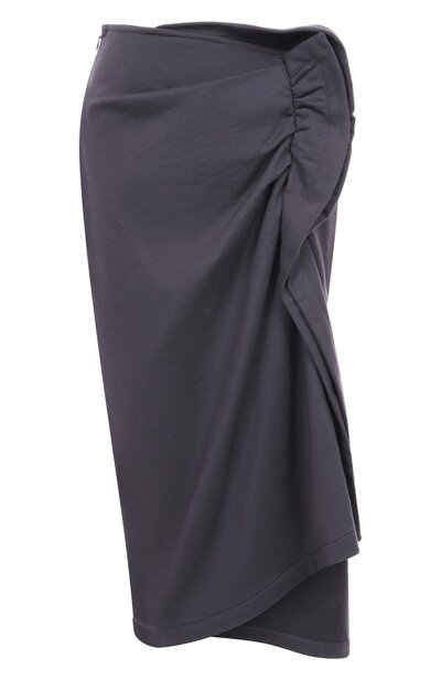 Ассиметричная миди-юбка из хлопкового трикотажа застегивается потайной молнией сбоку. Драпировку спереди подчеркнули узкими оборками.