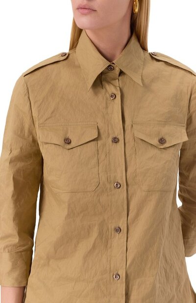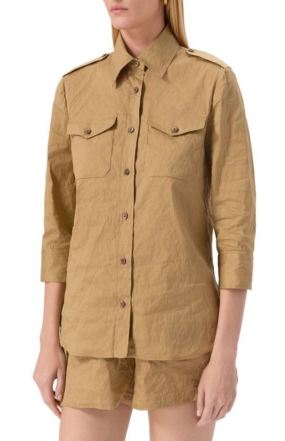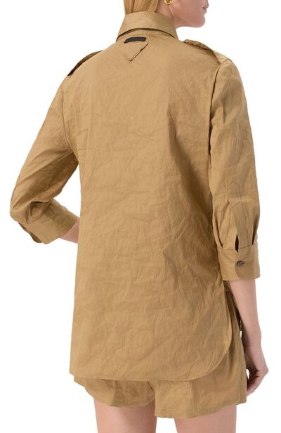 Рубашку с рукавами 3/4 и фигурным низом сшили из жатого хлопкового поплина с добавлением металлизированных волокон. Модель с погонами и нагрудными накладными карманами украсили фирменными нашивками на спинке.