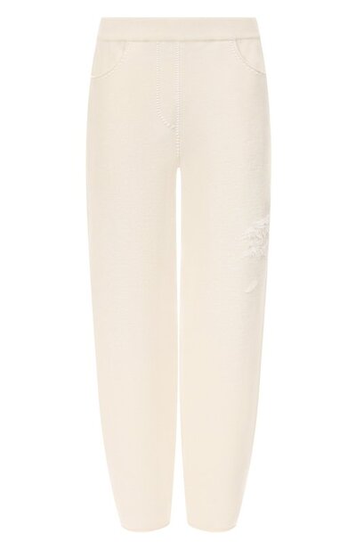 Брюки с эластичным поясом выполнили из трикотажа на основе шерсти мериноса, хлопка и вискозы. Спереди создали декоративные разрывы с бахромой, а швы подчеркнули фактурным узором в виде стежков. Помимо боковых карманов, предусмотрели очертания задних с фирменной эмблемой.