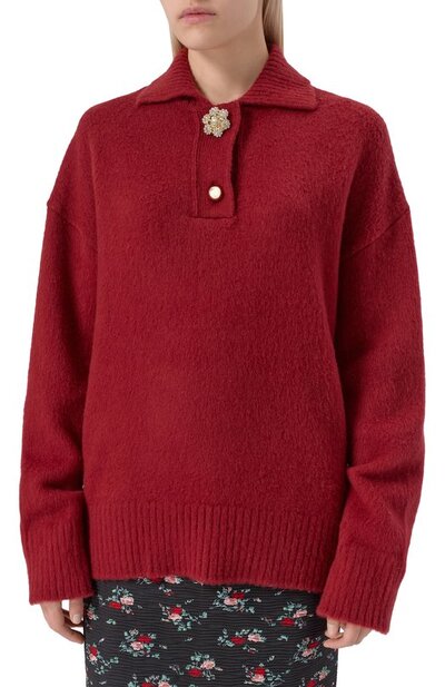 Свитер со спущенной линией плеч и воротником поло связали из чистой шерсти. Модель с отделкой в рубчик застегивается двумя акцентными пуговицами на короткой планке спереди.