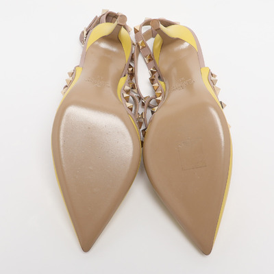 These authentic Valentino pumps pair glossy yellow patent with Rockstud beige leather straps. The pointed toe and ankle closure ground the bold palette with a structured finish.