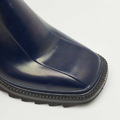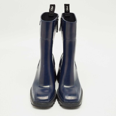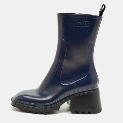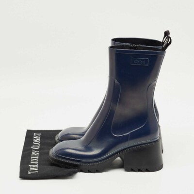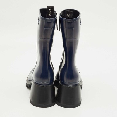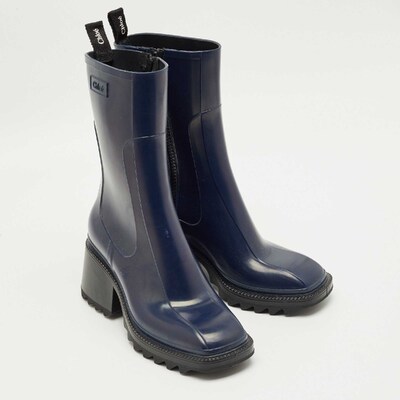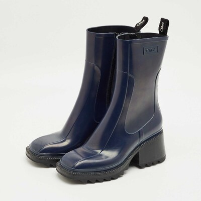 Stay stylish even on rainy days with the Chloe Betty boots in rich navy blue rubber. Their sleek silhouette and chunky sole offer both practicality and charm. Effortless to style with jeans or dresses.