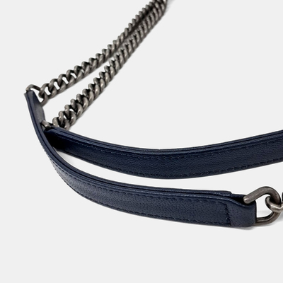 Chanel’s navy blue leather, paired with a refined chain strap, forms a timeless silhouette that radiates understated elegance. Spacious enough for essentials yet sleek in design, it effortlessly elevates casual and formal looks alike, embodying modern luxury with classic Parisian flair.