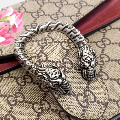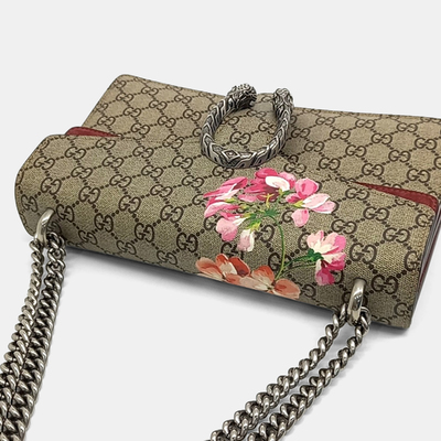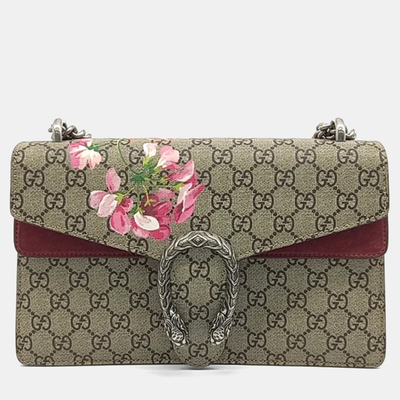 Gucci brings romantic sophistication to beige coated canvas with a subtle floral motif. The chain shoulder design balances practicality with luxury, making it a statement piece for modern wardrobes.