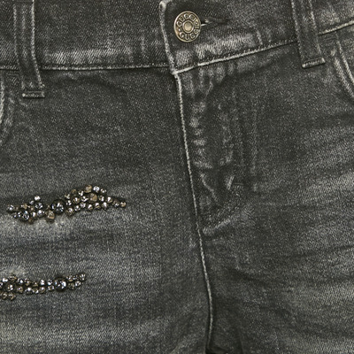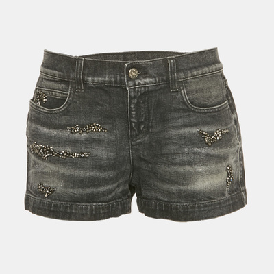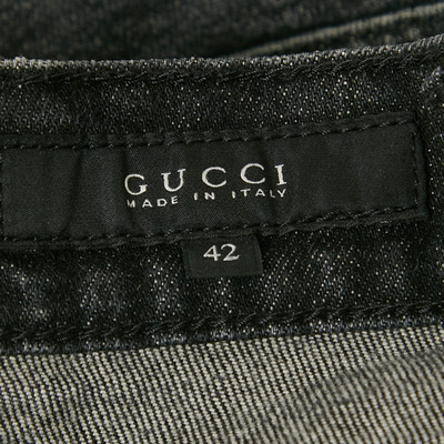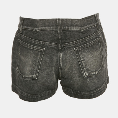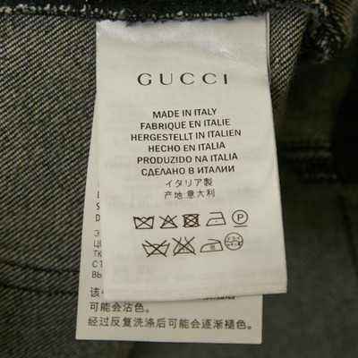 Gucci’s denim shorts feature a washed black finish, pockets, subtle embellishments, and a front zip closure. A tailored fit meets distinctive detailing, balancing casual wearability with luxury branding.