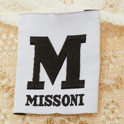 In size M, this Missoni white V neck knit top showcases a seashell inspired lace pattern interwoven with metallic Lurex threads. Light and breathable with short sleeves, it moves seamlessly from casual daytime wear to dinner plans, always with understated elegance.