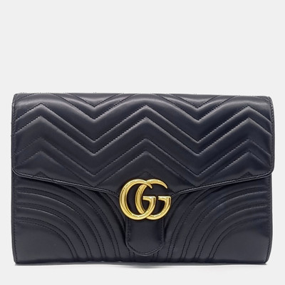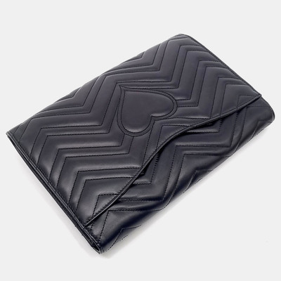 The Gucci Black Leather Marmont Matelassé Clutch offers a refined, compact design for carrying essentials. Crafted in black leather with signature matelassé quilting, it features a clean, versatile shape suitable for day or evening wear. Small yet stylish, this clutch adds a subtle designer touch to any outfit.