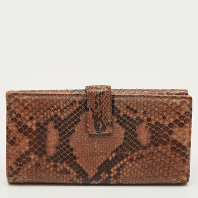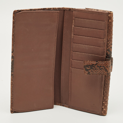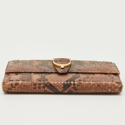 Gucci gives a touch of distinction to this continental wallet in python leather. The flap front is accented with a gold tone spur detail, echoing the brand’s equestrian codes. Inside, multiple sections keep cards and currency orderly, wrapped in the texture and rarity of exotic skin.
