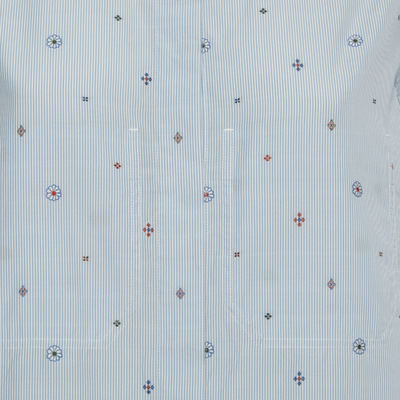 Celine reworks the striped cotton shirt with embroidered motifs and an asymmetric hem, turning a wardrobe essential into something directional. The oversized fit lends itself to easy layering and everyday styling.