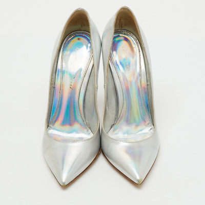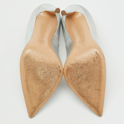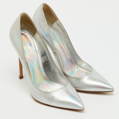 These Gianvito Rossi pumps bring futuristic energy to a timeless shape, crafted in holographic silver leather. The pointed toe design elongates the foot while reflecting light with every movement, creating a striking visual effect. Balancing avant garde appeal with classic lines, they are a versatile piece for making polished, standout statements.