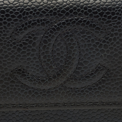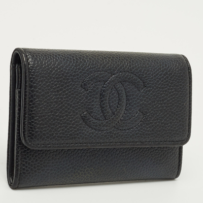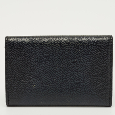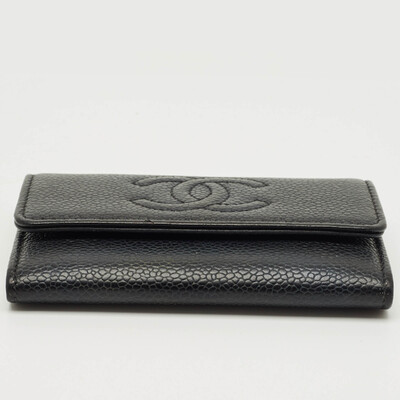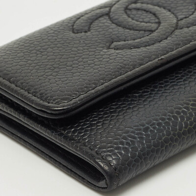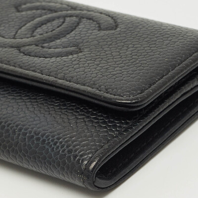 In durable black caviar leather, this Chanel card case is designed with the house’s signature flap style. The raised CC emblem highlights the front, keeping the design instantly recognizable. Compact and functional, it offers slots for cards while slipping neatly into any bag or pocket.