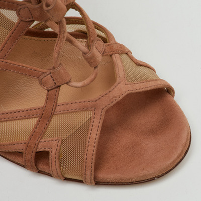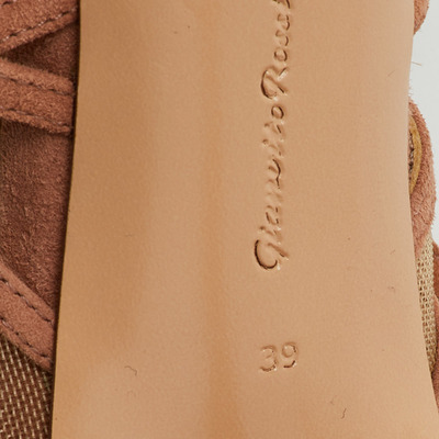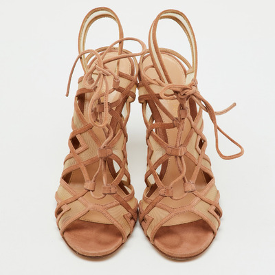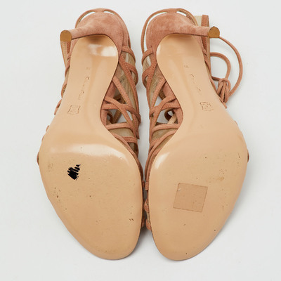 Architectural lines define Gianvito Rossi’s Adria sandals, designed in beige suede and mesh with a cage like construction. Their balanced composition of structure and transparency creates a modern, sculptural effect, while the neutral tone allows seamless styling. Perfect for evenings, these heels reflect the brand’s refined approach to innovative footwear design.