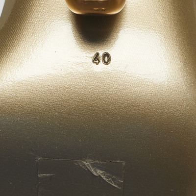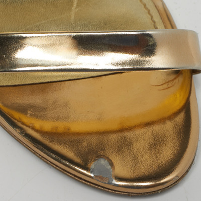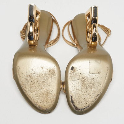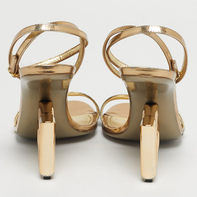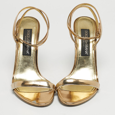 Dolce and Gabbana’s Keira sandals shine in metallic gold leather. Designed with a sleek ankle strap and DG logo detailed heel, they bring glamour to evening ensembles. A striking pair for special occasions.
