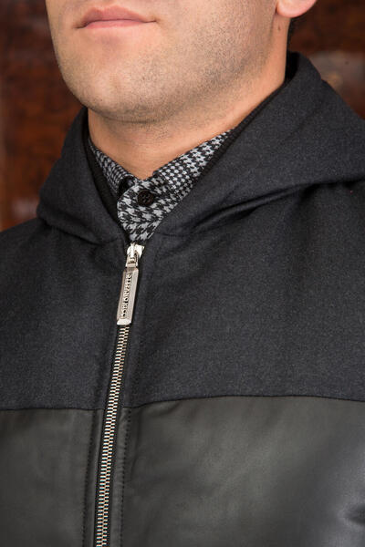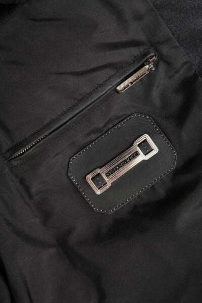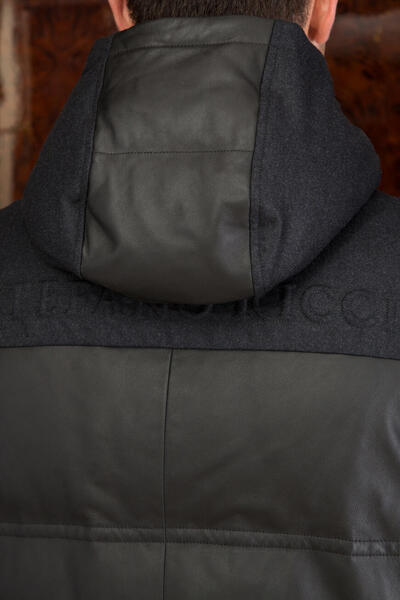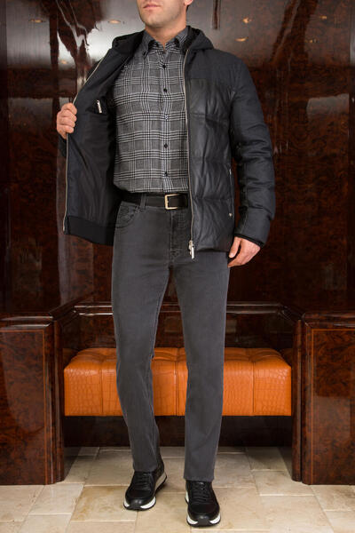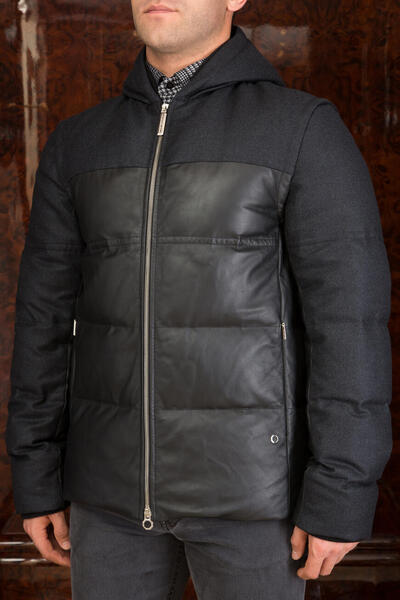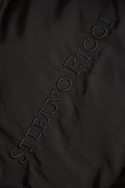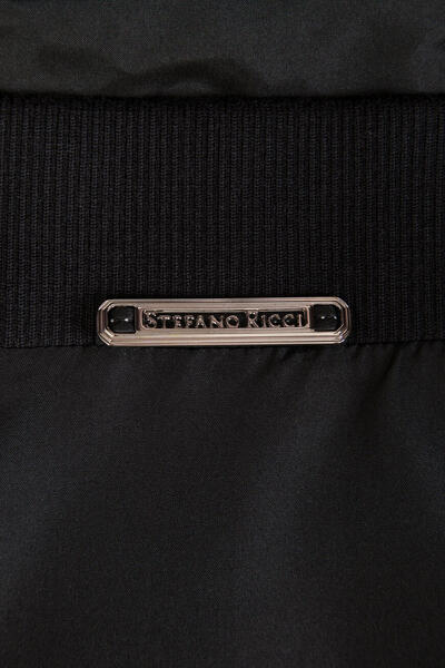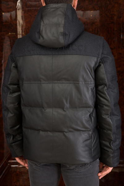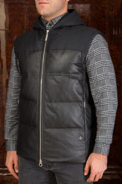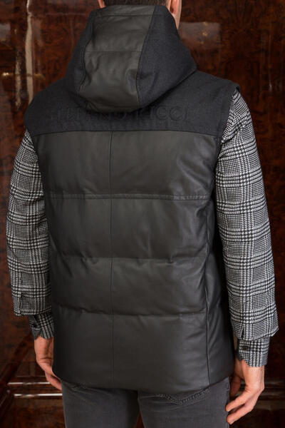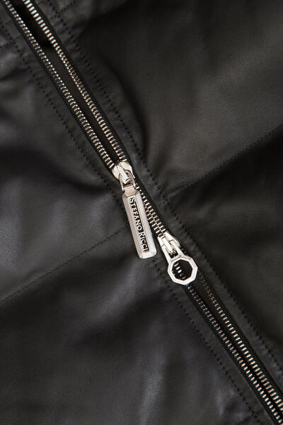 Оригинальная стёганая мужская куртка Stefano Ricci чёрного цвета из двух видов ткани: из натуральной кожи ягнёнка и мягкого трикотажа на основе натуральной шерсти и фирменного кашемира. Универсальная модель прямого кроя, с длинными отстёгивающимися рукавами с трикотажными манжетами на резинке, удобной застёжкой-молнией с двумя фирменными брендированными бегунками, невысоким трикотажным воротником-стойкой с фактурой в рубчик, комфортным объёмным капюшоном, двумя прорезными карманами на молнии по бокам и потайным внутренним карманом на молнии. Фишки изделия: лаконичная металлическая деталь снизу слева и объёмная фирменная надпись бренда сзади под капюшоном. Внутреннюю часть украшают фирменные металлические планкеты с логотипом и крупный вышитый лого в тон. Куртка дополнена наполнителем на основе натурального гусиного пуха и пера.