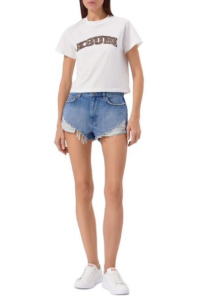 Джинсовые шорты Kali с рваными краями сшили из хлопкового денима. Модель с высокой посадкой и пятью карманами украсили фирменной вышивкой 3x4 сзади и эмблемой T-box сбоку.