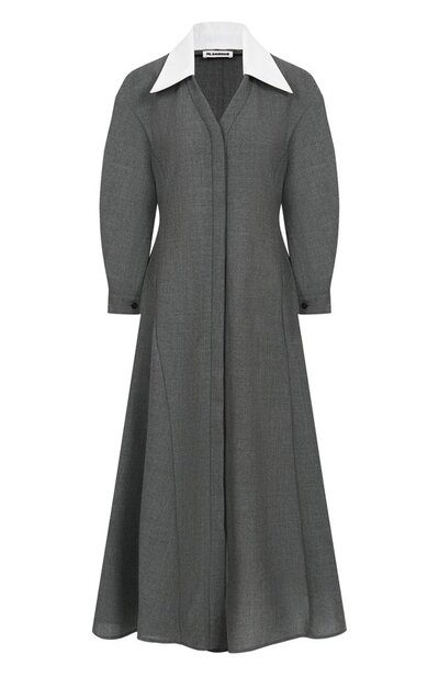 Платье-рубашку с V-образным вырезом, супатной застежкой и объемными рукавами 3/4 выполнили из шерстяного канваса. Модель дополнили съемным воротником из хлопкового поплина.