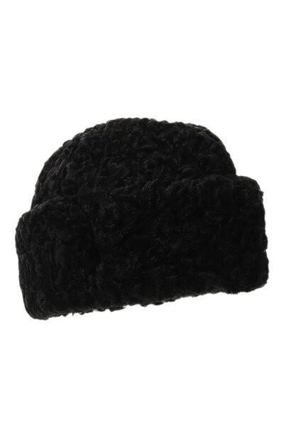 Черная шапка с широким отворотом и вмятиной на тулье сшита вручную из фактурного меха каракульчи. Легкий эргономичный аксессуар, напоминающий пилотку, дополнен подкладкой с особой конструкцией. Она создает вокруг головы свободное пространство, сохраняя прическу.