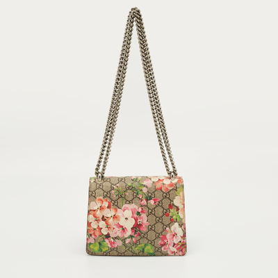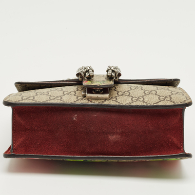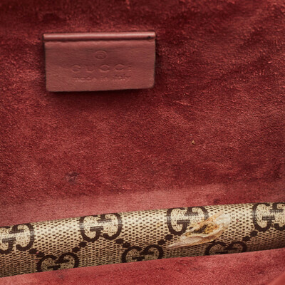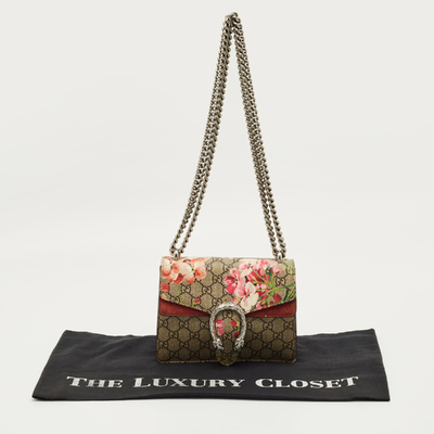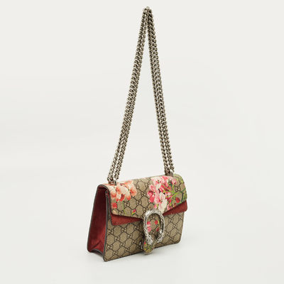 Gucci’s mini Dionysus shoulder bag marries beige GG Supreme canvas with a burgundy Blooms print, giving the structured silhouette a romantic twist. The signature tiger head clasp anchors the design. Wear crossbody with muted outfits to let the print stand out.