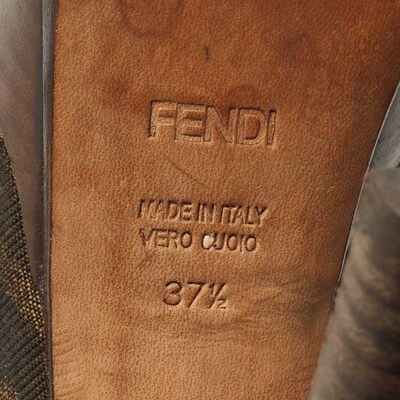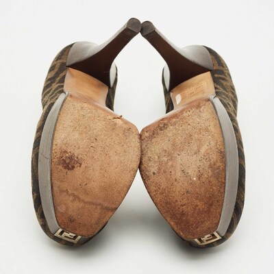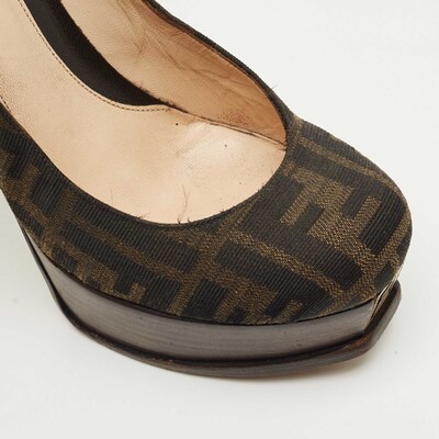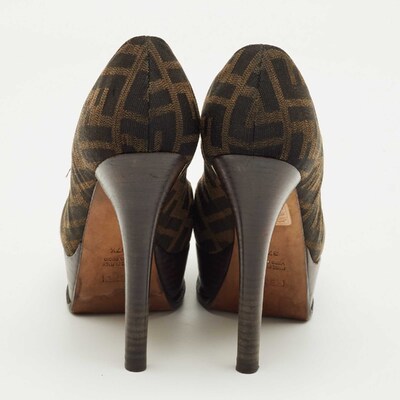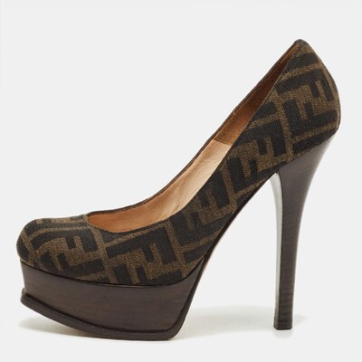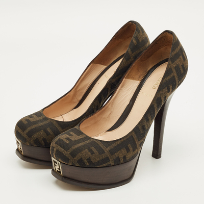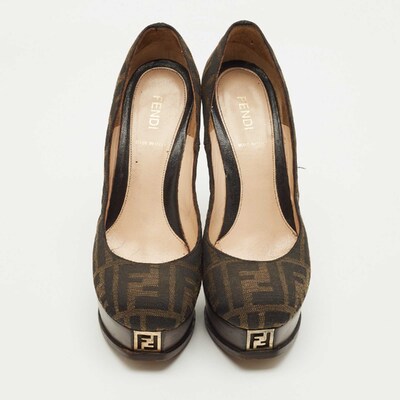 These pumps showcase the house’s signature Zucca canvas, balanced on towering platforms with a gold tone logo plaque at the front. 13.5 cm heels add height.