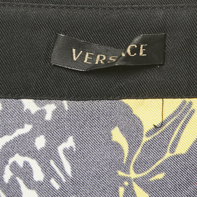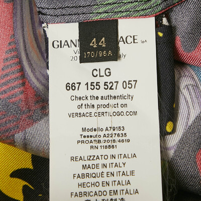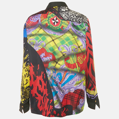 This Versace silk shirt feels like stepping into a gallery of bold prints—animal motifs, baroque swirls, and geometric patterns colliding in vivid color. The sharp collar and button down design ground the riot of detail, while still offering comfort wrapped in a burst of colors.