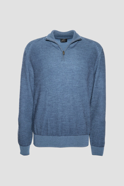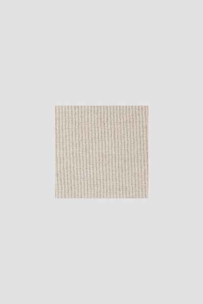 Трикотажный свитер Brioni в бежевом и белом тонах. Для изготовления изделия с высоким воротником-стойкой на молнии используются мягкая шерсть и кашемир. Модель декорирована геометрическим мотивом в виде узких полос, создающим на поверхности меланжевый эффект. Конструкция свитера характеризуется прямым силуэтом и наличием широкого эластичного пояса и манжет-резинок для большего удобства в носке.