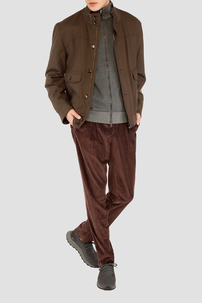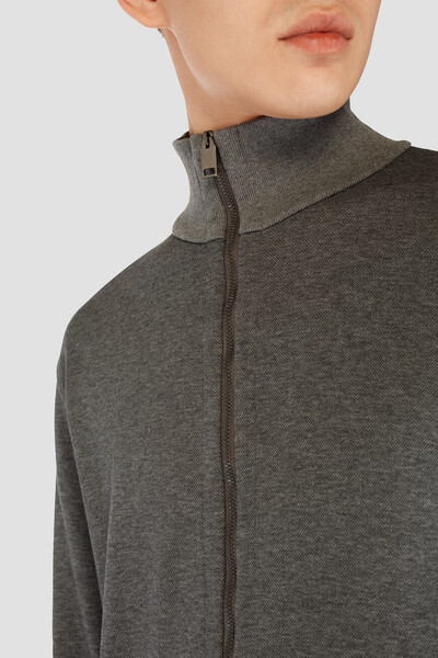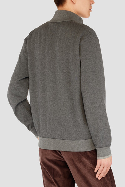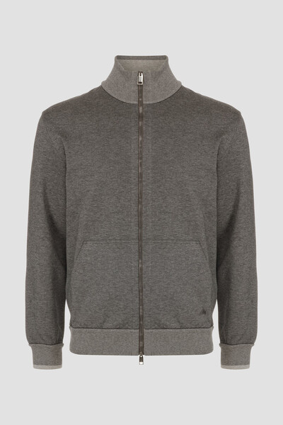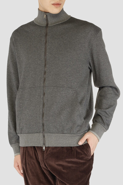 Меланжевая толстовка на встречной молнии от Brioni. Для производства изделия прямого силуэта выбран плотный трикотаж на основе хлопка и прочного нейлона серого цвета. Конструкция модели характеризуется наличием высокого воротника-стойки и двух крупных накладных карманов по бокам. Горловина, манжеты рукавов и широкий пояс дополнены резинкой на несколько тонов светлее основы. На принадлежность толстовки Дому указывает вышитый тональный логотип на левом кармане.