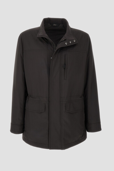 Тёмно-коричневая куртка Brioni из коллекции Performa Essential. Для производства изделия с высоким воротником-стойкой используется прочный полиэфир - инновационная микрофибра Performa, отличающаяся ветро- и влагозащитными свойствами. Скрытая кулиска по линии талии формирует прилегающий силуэт. Модель застёгивается на потайную молнию и клёпки со штормовой планкой, а манжеты длинных рукавов - крупной пуговицей. Помимо основных многофункциональных карманов с клапанами по бокам в куртке предусмотрены нагрудный прорезной с кожаной вставкой слева и внутренний карман на роговой пуговице.