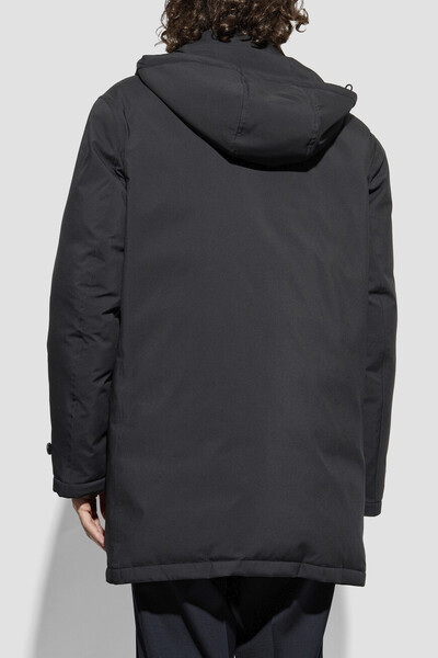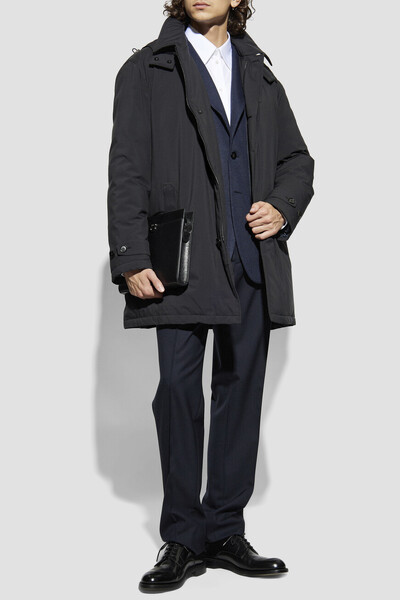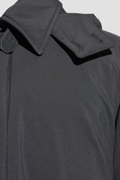 Утеплённый плащ Brioni с глубоким отстёгивающимся капюшоном на двух пуговицах спереди. Модель из прочного матового полиэфира чёрного цвета является искусным сочетанием технических инноваций и непреходящего итальянского мастерства. Изделие отличается слегка удлинённым силуэтом, который идеально подходит для носки поверх пиджака, подтверждая его статус незаменимого предмета гардероба как для деловых людей, так и для изысканного отдыха. За надёжную защиту от холода отвечает премиальный наполнитель на основе пуха и пера, обеспечивающий комфорт без утяжеления.