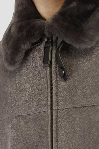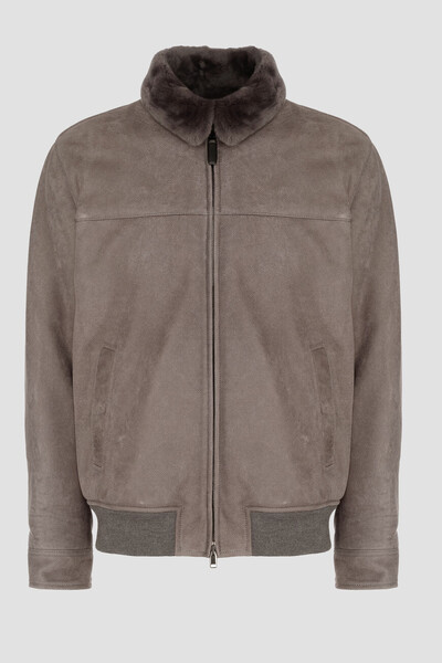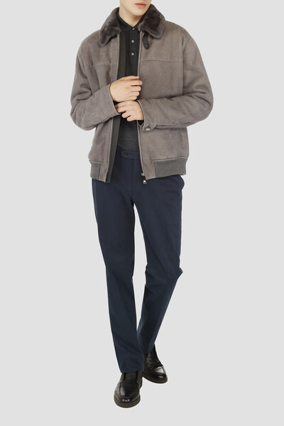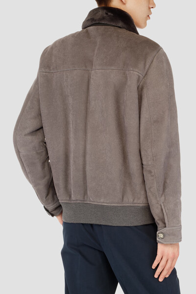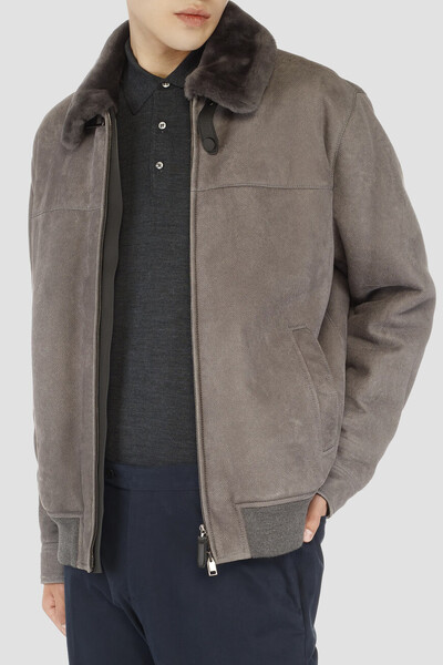 Адаптированный для морозной погоды бомбер Brioni трансформирован в дублёнку. Для создания модели прямого силуэта выбрана особенно нежная и тонкая овчина серого цвета, выделанная вручную столь искусно, что она не уступает ткани в мягкости. Густой выпрямленный мех с лёгким блеском подчёркивает отложной воротник, который можно поднять в ветреный день и зафиксировать чёрным кожаным ремешком. Внутри - также натуральный мех, обеспечивающий комфорт и надёжную защиту от непогоды.