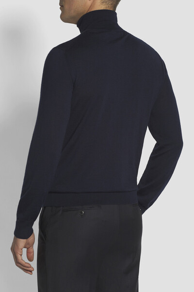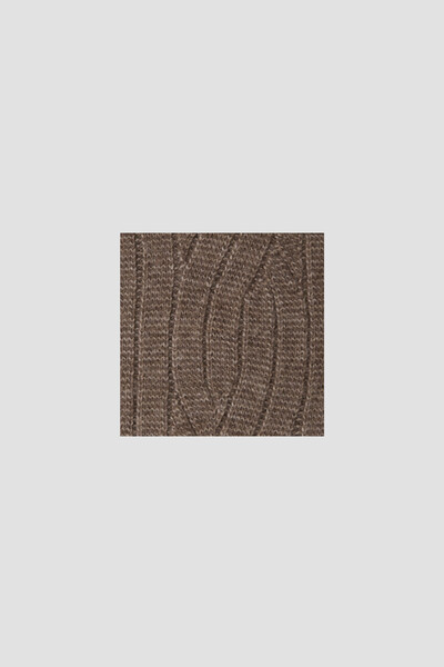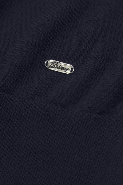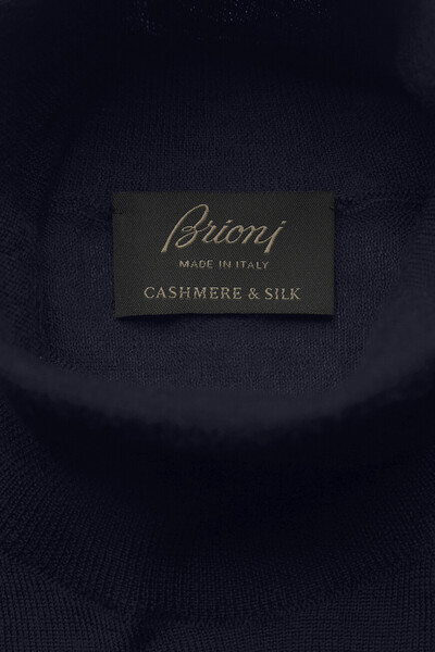 Неустаревающий вязаный свитер Brioni коричневого оттенка. Для создания повседневной модели выбрана комбинация из кашемира и гладкого шёлка. Отличительными особенностями изделия стали наличие высокого воротника фасона «гольф», как у водолазки, и минималистичного знакового декора: жатого восьмиугольного лейбла с гравировкой Дома.
