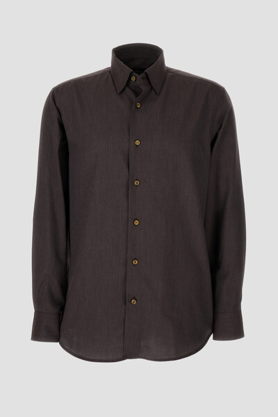 Фланелевая рубашка Brioni с длинными рукавами. Фасон изделия, выполненного на основе хлопка тёмно-коричневого оттенка, характеризуется прямым силуэтом и застёжкой на перламутровые пуговицы. Модель с закруглённой нижней частью станет основой для создания мужских casual-комплектов.