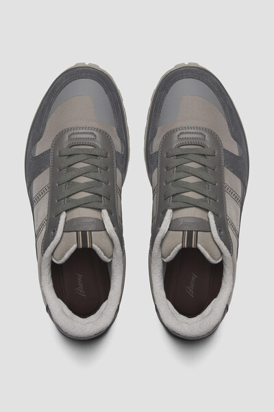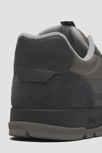 Комбинированные сникеры Crossing от Brioni выронены в серой гамме. Удобная пара, вдохновлённая легендарными баскетбольными моделями 1980-х годов, выполнена из плотной технической ткани, гладкой телячьей кожи и бархатистой замши. Конструкция Strobel в сочетании с эргономичными брендированными стельками обеспечивает максимальный комфорт, гибкость и надёжную поддержку голеностопа. Дизайн изделия завершается кожаным патчем с тиснёным лого и деталью в полковую полоску на язычке, надписью-логотипом с 3D-эффектом сбоку на подошве и тональным логотипом на кожаной вставке в задней части.