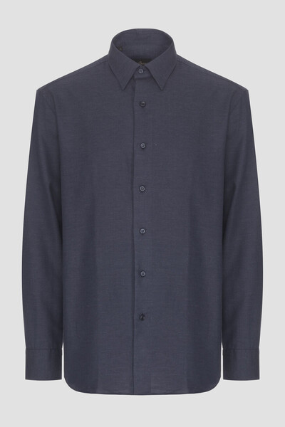 Рубашка прямого силуэта от Brioni. Классическая модель изготовлена из мягкого трикотажа на основе хлопка и кашемира тёмно-синего цвета. Характерными особенностями изделия являются пуговичная застёжка и наличие закруглённой нижней части, обеспечивающей комфорт во время носки.