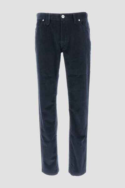 Пятикарманные брюки Meribel прямого силуэта от Brioni. Изделие выполнено из мягкого хлопкового вельвета стрейч тёмно-синего цвета с бархатистой поверхностью. Модель с застёжкой на молнию, покрытую планкой, и брендированную металлическую пуговицу украшают кожаная накладка с тиснёным логотипом на поясе сзади и серебристая вставка в виде дизайнерской литеры «B» на левом кармане спереди.