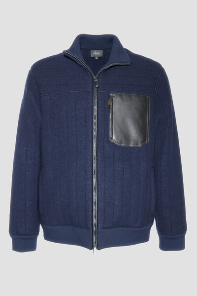 Блузон Brioni с вязаным геометрическим мотивом в виде полос. Для изготовления изделия глубокого синего цвета выбран мягкий трикотаж на основе вирджинской шерсти, хлопка и нежнейшего кашемира. Роль функционального декора передана крупному нагрудному карману на молнии слева, выполненному из гладкой кожи ягнёнка. Атрибутом Дома является тиснёный логотип в дизайнерском начертании, размещённый на кармане.