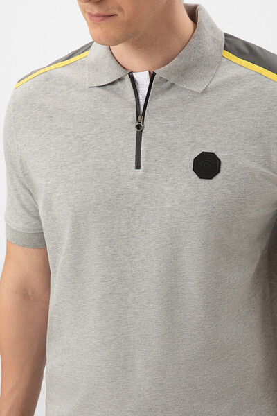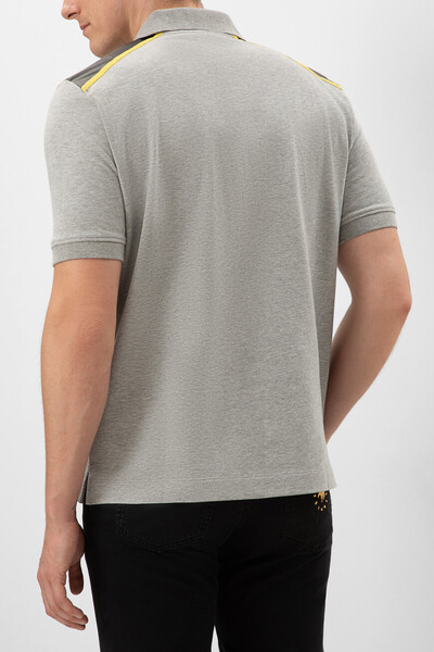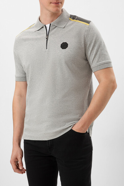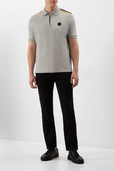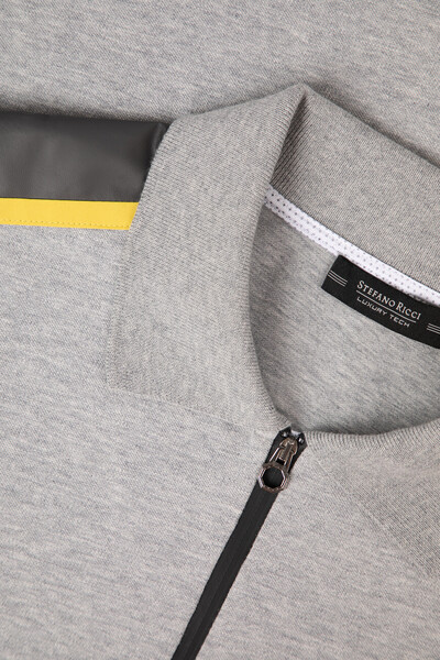 Меланжевое поло Stefano Ricci выполнено в сером цвете. Изделие из смесового хлопка стрейч декорировано деталями в чёрно-жёлтой гамме на уровне плеч, которые удачно впишутся в любой образ. Отложной воротник на короткой застёжке-молнии с чёрной отделкой и манжеты в рубчик обеспечат функциональность. Модель отличается наличием чёрной эмблемой в виде логотипа линии SR LUXURY TECH слева на груди и неглубокими боковыми разрезами.