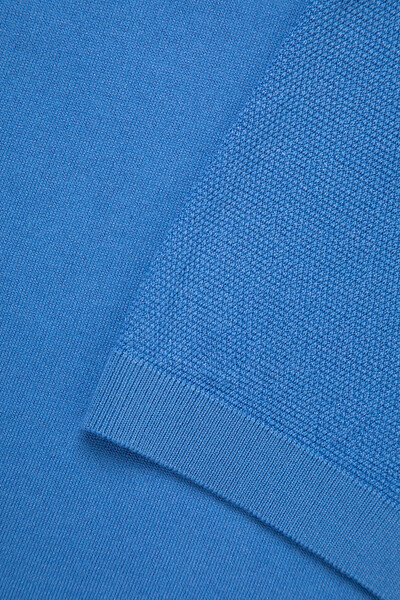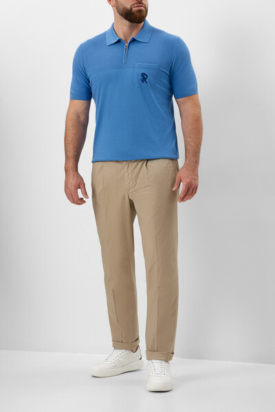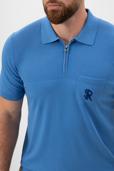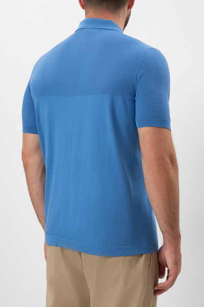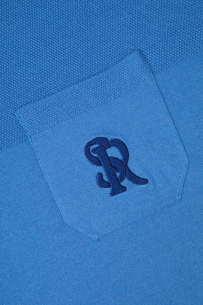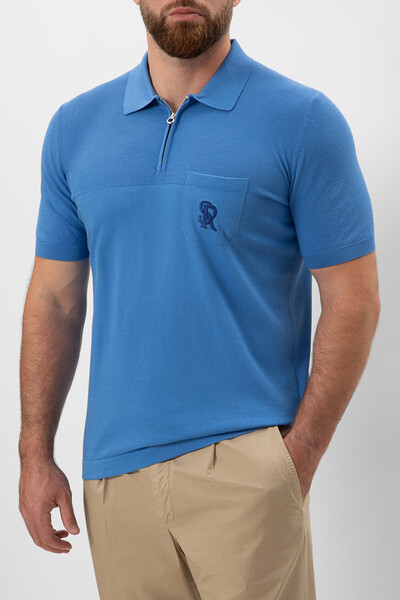 Поло Stefano Ricci с нагрудным накладным карманом слева. Модель изготовлена из мягкого трикотажа на основе хлопка и гладкого шёлка насыщенного светло-синего цвета. В роли декора выступают фактурная вставка-узор сверху и на рукавах и вышитая тёмно-синяя монограмма Дома, расположенная на кармане.
