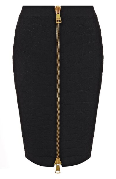 Короткую облегающую юбку с фактурным узором, напоминающим кожу крокодила, выполнили из мерцающего трикотажа на основе вискозы. Модель дополнили спереди встречной молнией, позволяющей сформировать разрез.
