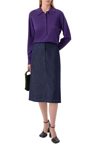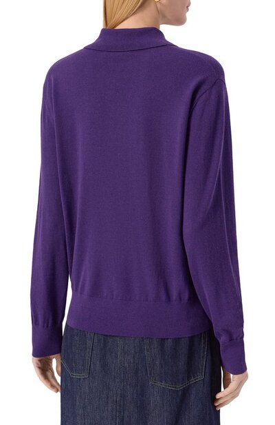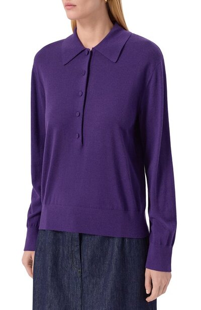 Поло со спущенной линией плеч, эластичными манжетами и поясом выполнили из шерстяного трикотажа. Модель с отложным воротником застегивается пятью пуговицами, обтянутыми таким же материалом.