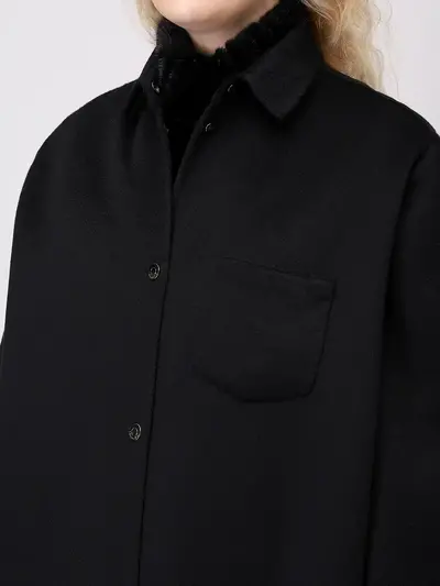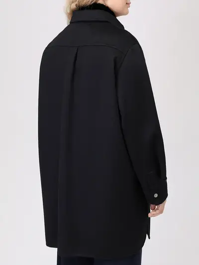 -Модель свободного кроя с боковыми разрезами, длинными рукавами с манжетами, нагрудным накладным карманом, отложным воротником и застежкой на кнопки.