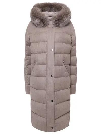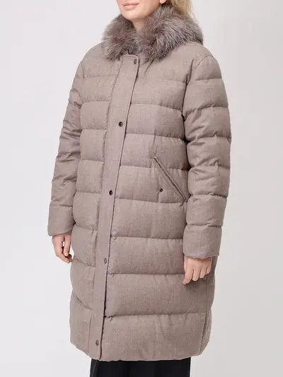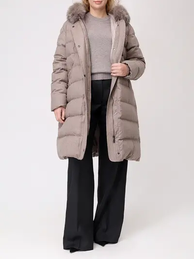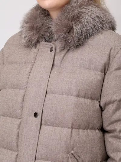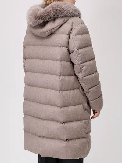 -Модель прямого кроя с длинными рукавами, прорезными карманами с клапанами, застежкой на молнию и кнопки, капюшоном с отделкой натуральным мехом лисы.