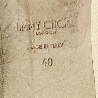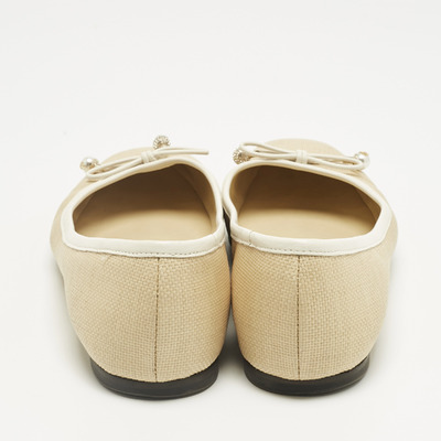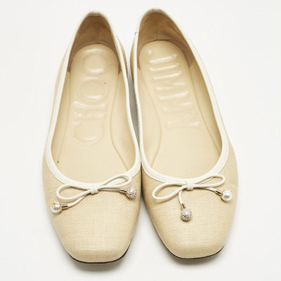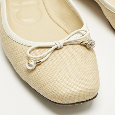 These Jimmy Choo Elme flats combine beige and white leather with woven raffia accents and a charming bow detail. A fresh, feminine addition to any warm weather wardrobe.
