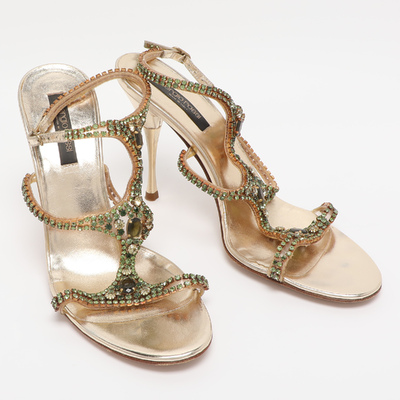 These gold leather Sergio Rossi sandals offer instant glamour with their metallic sheen and classic ankle strap silhouette. Lightweight and elegant, they’re perfect for evening wear or celebratory events. A must have for those who love understated sparkle.