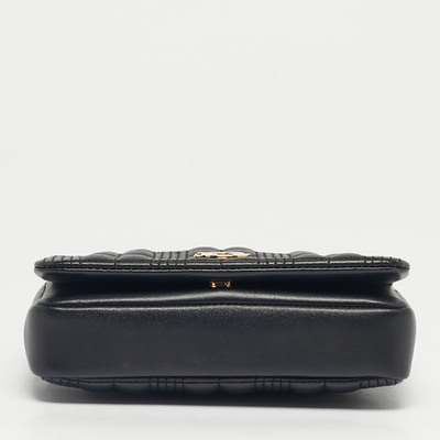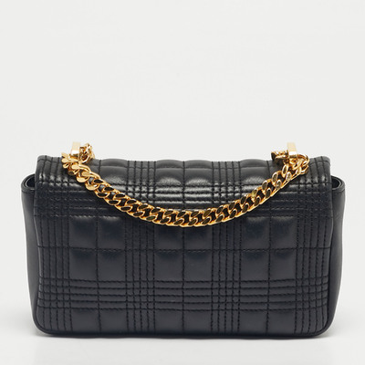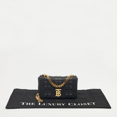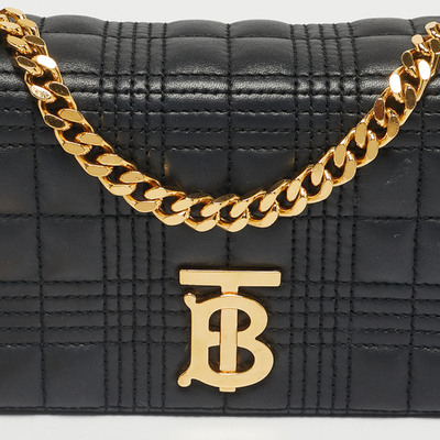 The Mini Lola is softly structured in quilted black leather, accented with a gold TB monogram at the front. A sliding chain strap allows for shoulder or crossbody wear. Compact and versatile, it carries the house’s modern elegance in miniature form.