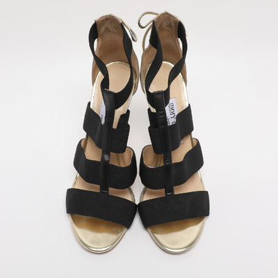 These Jimmy Choo cage sandals feature a striking mix of gold and black leather with elastic straps for a secure yet flexible fit. Bold and modern, they create a sculpted silhouette that complements both dresses and tailored pieces. A chic choice for nights out.