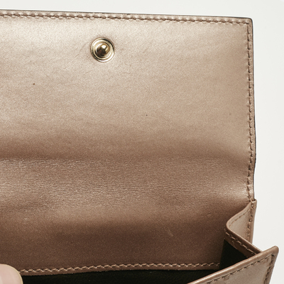 Gucci’s Guccissima leather becomes the backdrop for a gleaming heart motif, adding charm to this French wallet. Compact yet practical, it opens to card slots, a bill compartment, and coin pocket.