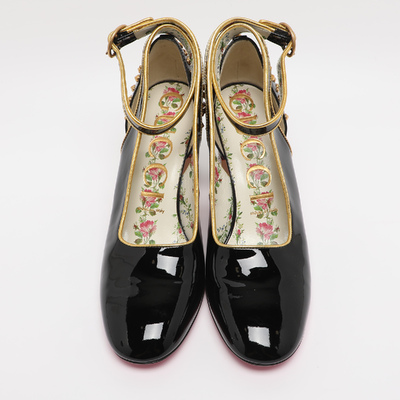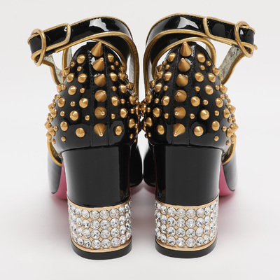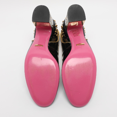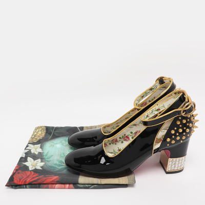 Gucci gives classic Mary Jane lines a rebellious edge in these black patent pumps. Studded with gold spikes on the counter and finished with a crystal set block heel, they bring both drama and glamour.