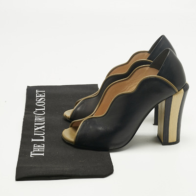 Fendi softens the sharpness of black leather with scalloped edging on these peep toe pumps. Feminine details and sleek design create a balanced, versatile pair.